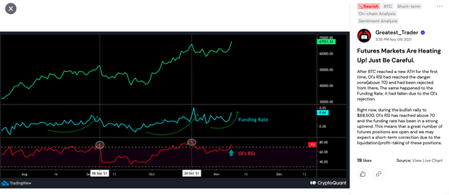 크립토퀀트 인증 애널리스트 그레이티스트 트레이더(Greatest_Trader)는 크립토퀀트 데이터를 인용해 "비트코인은 6만8500달러까지 상승세가 컸지만 미결제약정(OI)과 펀딩비도 큰 폭으로 동반 상승했다"면서 "레버리지 투자자의 청산이나 차익 실현 등 단기 조정 가능성이 커지고 있다"고 분석했다.