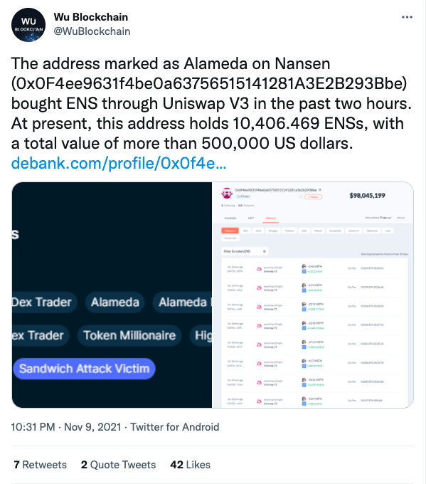 FTX 거래소 투자자이자 블록체인 투자 기업인 알라메다 리서치(Alameda Research)가 이더리움네임서비스토큰(ENS)를 50만 달러치 매입했다는 관측이 나왔다.