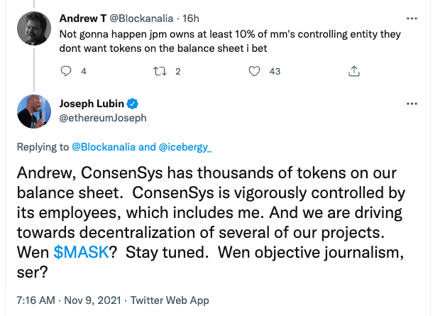 그는 이날 트위터에서 "모건스탠리가 메타마스크 지분 10%를 보유하고 있는데 이들은 대차대조표에 토큰이 등장하길 원하지 않을 것"이라는 앤드류 코인데스크 기자 의견에 "컨센시스의 대차대조표에는 이미 수천개 토큰이 포함돼 있다. 언제 메타마스크 토큰이 나올지 궁금하다면 계속 주목해달라"고 답했다.