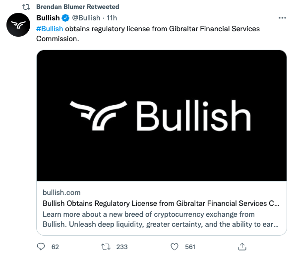 이오스(EOS) 블록체인을 활용한 가상자산 거래소인 불리시(Bullish)는 지난 9일(현지시간) 지브롤터(영국 직할식민지)의 금융서비스위원회(CFSC)로부터 분산원장기술(DLT) 라이선스를 획득했다고 밝혔다. 앞서 이오스 개발사 블록원은 불리시 거래소를 곧 출시할 예정이라고 발표한 바 있다.