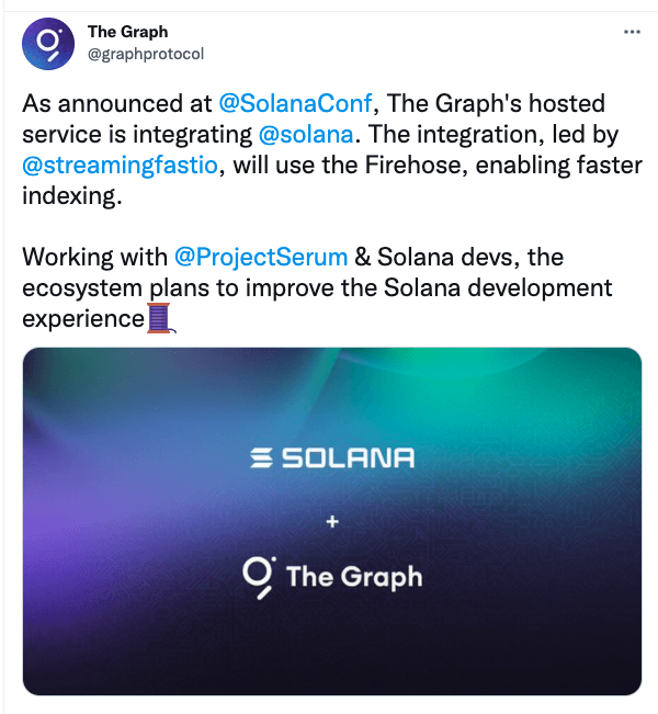 더그래프는 이날 트위터를 통해 "우리는 솔라나 컨퍼런스에 참여해 솔라나 블록체인 데이터를 연결할 수 있도록 지원하겠다고 발표했다"면서 "솔라나와 세럼(SRM) 생태계에서 개발자 경험(DX)을 향상시키기 위해 돕겠다"고 말했다.