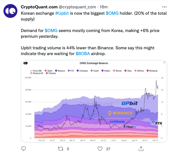 가상자산 분석기업 크립토퀀트는 10일 트위터를 통해 "OMG 토큰의 수요는 대부분 한국에서 발생하고 있다. 토큰의 김치 프리미엄도 6%에 달한다"면서 "이는 보바토큰(BOBA) 에어드랍을 받기 위한 움직임 일 수 있다"고 분석했다.