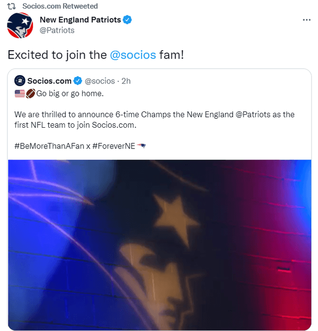 12일 가상자산(암호화폐) 전문 미디어 코인데스크에 따르면 미국 프로미식축구팀(NFL)인 뉴잉글랜드 패트리어츠(New England Patriots)가 칠리즈(CHZ)의 스포츠 팬 토큰 플랫폼 소시오스(Socios)와 파트너십을 체결했다.