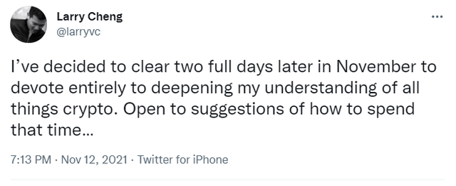 래리 쳉(Larry Cheng) 미국 반려동물 이커머스 츄이(Chewy) 공동 창업자이자 게임스탑 이사회 멤버가 자신의 트위터를 통해 "가상자산 지식 심화를 위해 이번 달에 이틀 휴가를 낸다"고 밝혔다.