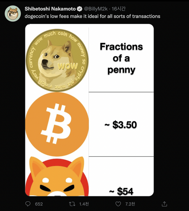 마커스는 글과 함께 도지코인의 수수료를 비트코인(BTC), 시바이누(SHIB)의 수수료와 비교하는 사진을 업로드 했다.