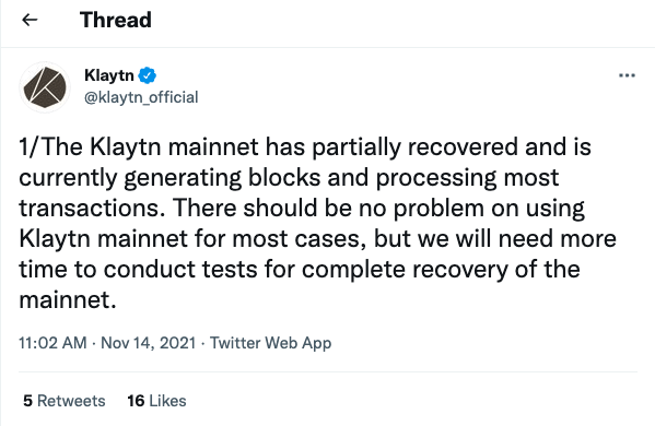 클레이튼은 이날 오전 11시 2분경 트위터를 통해 "클레이튼 메인넷은 부분적으로 복구가 완료됐다"면서 "현재 블록은 정상적으로 생성되고 있고 대부분의 기능과 트랜잭션을 정상적으로 처리하고 있다. 다만 완벽한 복구에는 시간이 더 걸릴 것"이라고 밝혔다.