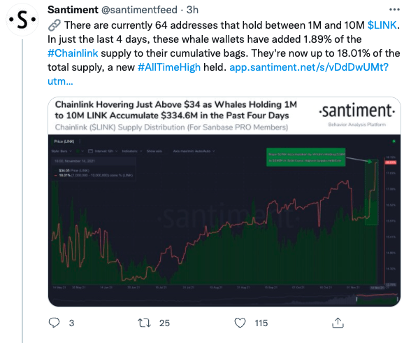 샌티멘트는 "최근 상위 64명의 고래가 보유한 LINK 물량은 역대 최고치를 경신했다"면서 "이들이 보유한 LINK 물량은 현재 전체 공급량의 18.01%에 달한다"고 덧붙였다.