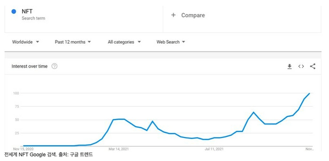 매체는 "구글 NFT 검색량 유입은 지난 8월·9월에 잠시 감소했지만 다시 증가세"라면서 "이제 NFT는 음악가 , 운동선수, 투자자, 정치인에 이르기까지 모든 유형의 산업에서 사람들과 회사의 관심을 끌고 있다"고 해석했다.