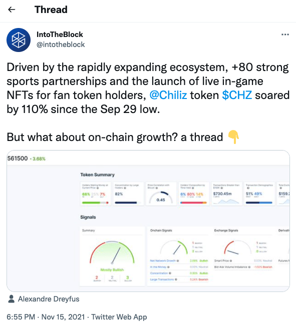 15일 가상자산(암호화폐) 데이터 분석 업체 인투더블록은 트위터를 통해 "최근 칠리즈(CHZ) 홀더 수는 연초에 비해 7배 이상 늘어난 15만명으로 집계된다"며 "기관투자자도 CHZ를 매수하고 있는 것으로 보인다"고 분석했다.