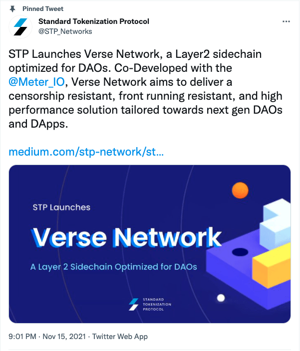 블록체인 기반 증권형토큰 플랫폼인 에스티피(STPT)는 15일 트위터를 통해 자체 사이드체인인 '벌스네트워크'(Verse Network)를 출시한다고 밝혔다.