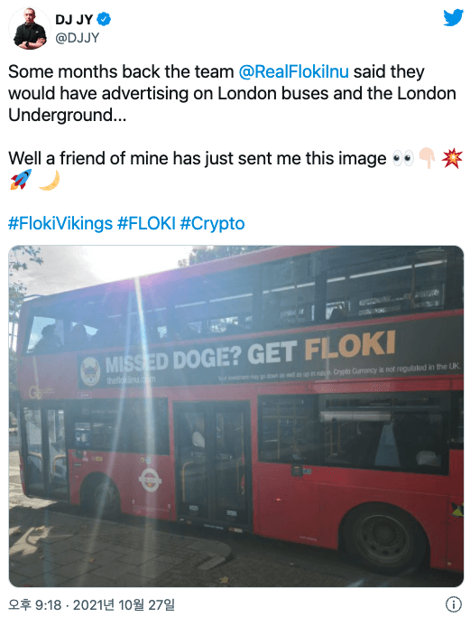앞서 지난달 영국 대중교통에는 "도지코인(DOGE)을 놓쳤다면 플로키(FLOKI)를 사라"는 옥외 광고가 등장한 바 있다.