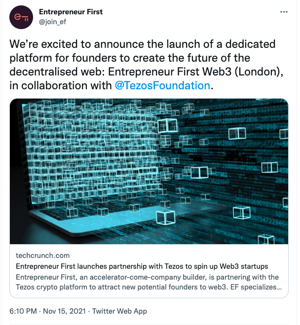 15일 가상자산(암호화폐) 전문 미디어 유투데이에 따르면 글로벌 엑셀러레이터인 '앙트레프레너 퍼스트'(Entrepreneur First)는 테조스(XTZ) 재단과 협력해 스타트업 설립 플랫폼 '앙프레프레너 퍼스트 웹3'를 출시했다고 밝혔다.
