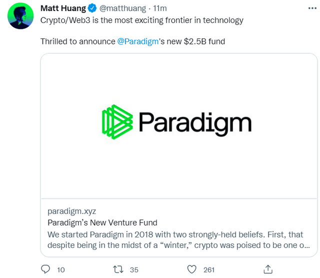 패러다임은 "차세대 가상자산 기업과 프로토콜에 계속 투자하기 위해 25억달러 규모의 새로운 벤처펀드를 조성했다"면서 "모든 성장 단계의 글로벌 벤처기업에 투자하겠다"고 밝혔다.