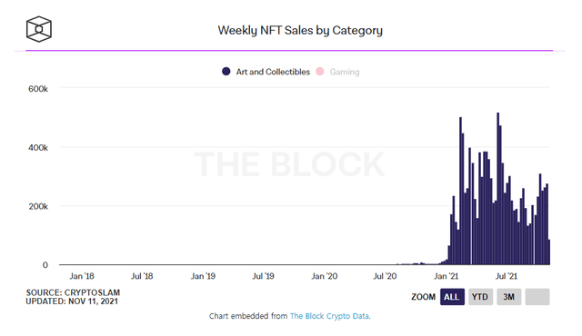 지난주 미술품 및 수집품 NFT 총판매량은 8만6870개로 알려졌다. 이는 10월 주간 판매량의 3분의 1 수준이다. 이에 매체는 "올해 여름 급증한 디지털아트에 대한 수요가 감소하기 시작했다"라고 파악했다.