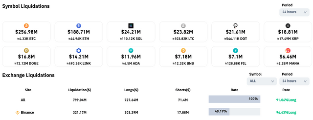 이날 청산 당한 포지션 중에서 비트코인(BTC) 롱 포지션은 2억4256만달러(약2865억원)에 달해 청산 물량 중 최대값을 기록했다. 청산 당한 이더리움(ETH) 롱 포지션은 1억6338만달러(약1930억원)로 집계됐다.