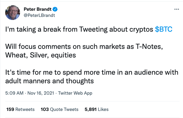 16일 가상자산(암호화폐) 전문 미디어 유투데이에 따르면 미국의 유명 가상자산 투자자 피터 브랜트(Peter Brandt)는 이날 자신의 트위터를 통해 "비트코인(BTC)이 5만3000달러, 이더리움(ETH)이 4030달러에 도달하면 매수하고 싶다"고 밝혔다.