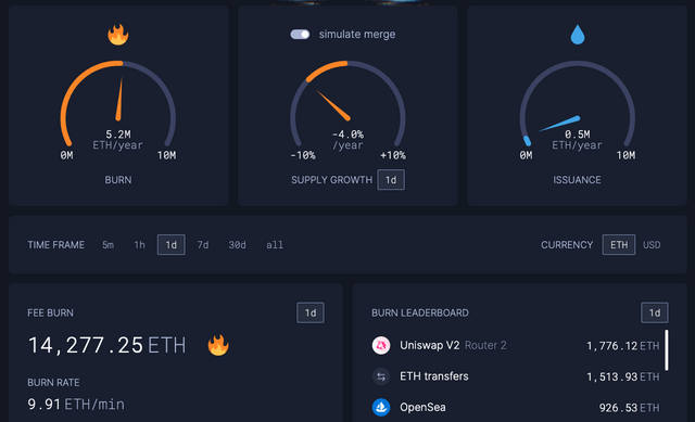 한편 이같은 속도로 토큰 소각이 계속된다면 이더리움의 연간 기대 인플레이션율은 -4.0%로 추정된다. 현재 이더리움 네트워크에서 발행되는 ETH보다 소각되는 물량이 더 많다는 설명이다.