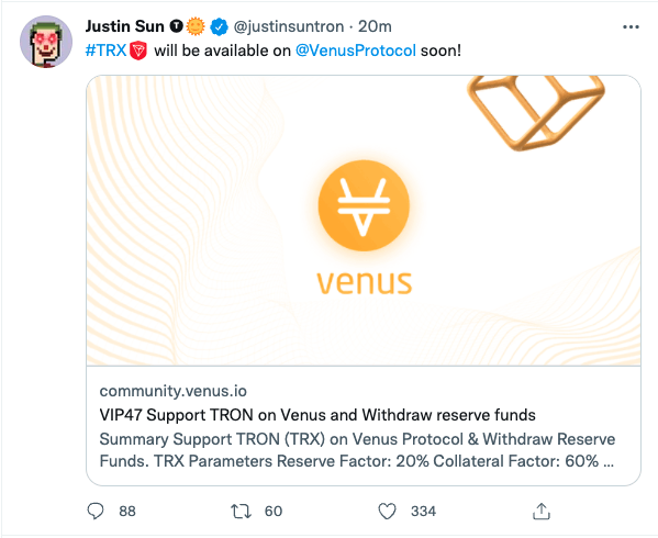 저스틴 선 트론 창업자는 이날 트위터를 통해 "비너스 프로토콜에서 곧 TRX를 사용할 수 있다"고 설명했다.