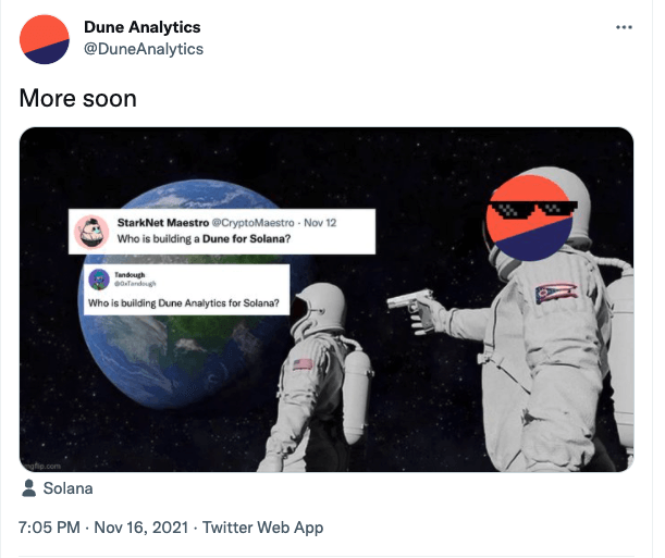 이날 듄 애널리틱스는 트위터에서 "듄은 언제 솔라나 네트워크를 지원하느냐"는 트윗에 "곧"이라고 답했다.
