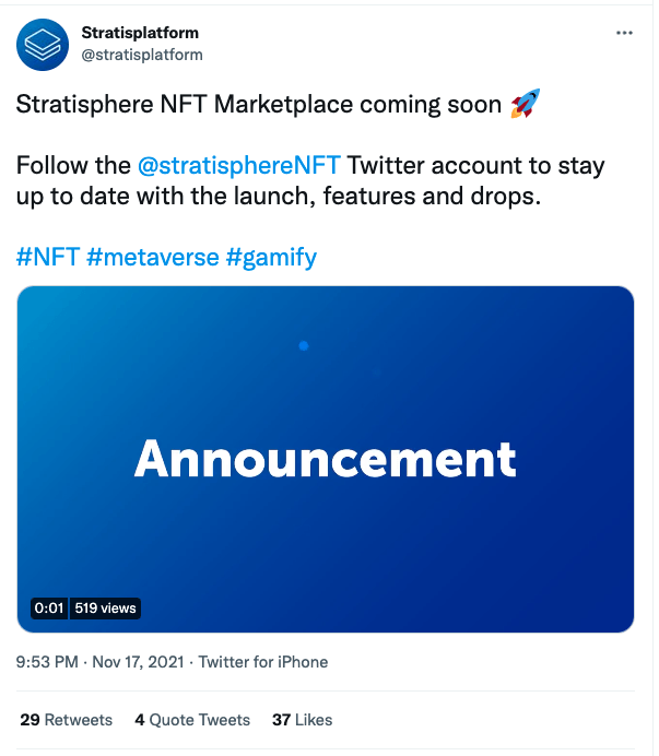 스트라티스(STRAX)는 17일 트위터를 통해 대체불가토큰(NFT) 마켓플레이스를 출시할 계획이라고 밝혔다.