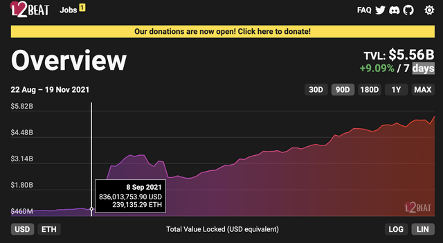 20일(현지시간) 블록체인 데이터 통계 사이트인 엘투비트(l2BEAT)에 따르면 이더리움(ETH)의 레이어 2 네트워크에 예치된 총 자산(TVL) 규모가 전주 대비 9% 오른 55억 달러를 돌파하면서 사상 최고치를 기록했다.