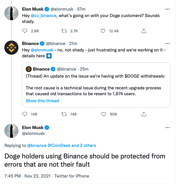 23일 글로벌 가상자산(암호화폐) 거래소 바이낸스가 도지코인(DOGE) 출금 장애가 발생한 가운데 일론 머스크(Elon Musk) 테슬라 최고경영자(CEO)는 이날 트위터를 통해 "바이낸스 도지코인 홀더들은 자신의 잘못이 아닌 (시스템) 에러 등으로부터 보호받아야한다"고 말했다.