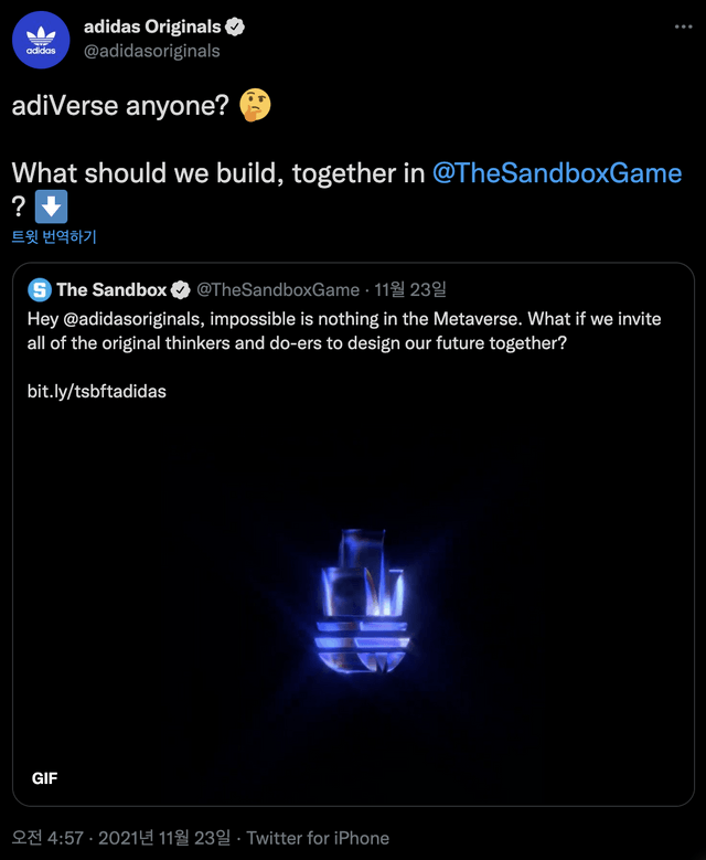 23일(현지시간) 중국 가상자산(암호화폐) 미디어 우블록체인은 아디다스 오리지널이 더 샌드박스의 메타버스 내에 아디다스 메타 유니버스, '아디버스(adiVers)'를 구축한다는 사실이 알려지면서 SAND의 가격이 전날 대비 최대 36%까지 올랐다고 밝혔다.