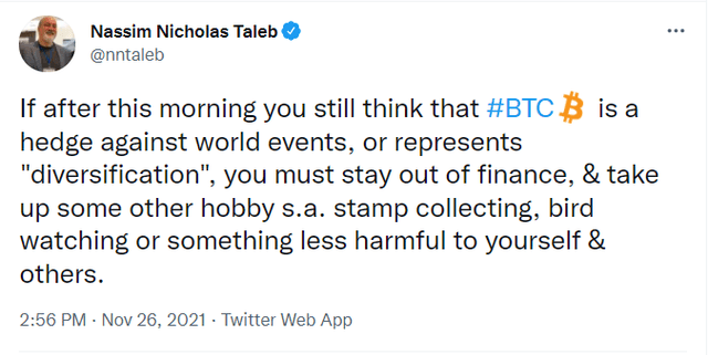 26일 '블랙 스완'의 저자 나심 니콜라스 탈레브 교수가 자신의 트위터에서 "당신이 오늘 아침 이후에도 비트코인(BTC)이 헷지 수단이라 생각했다면, 당신은 금융(Finance)을 멀리하고 다른 취미를 가져야 한다"고 밝혔다.