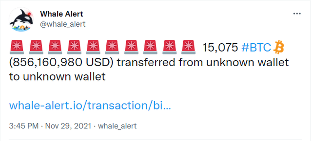 익명 주소서 익명으로 1만 5075 BTC 이체…1조 2000억원 규모수정 오전 10:56 · 2021. 11. 29.입력 오전 10:56 · 2021. 11. 29.기사출처김정호 기자00공유하기링크 복사텔레그램엑스카카오톡29일 가상자산(암호화폐) 트랜잭션 추적 사이트 웨일 알러트(Whale Alert)에 따르면 30일 00시 43분경 익명 주소에서 익명으로 1만 5075 BTC(약 1조 2000억원)가 이체됐다. BTC김정호 기자reporter1@bloomingbit.io안녕하세요 블루밍비트 기자입니다.