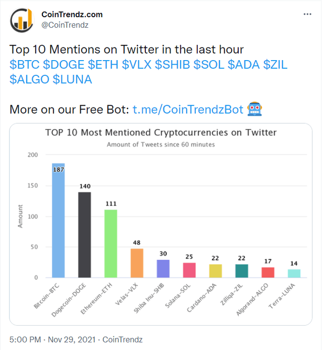 4위~10위에는 벨라스(VLX, 48회), 시바이누(SHIB, 30회), 솔라나(SOL, 25회), 에이다(ADA, 22회), 질리카(ZIL, 22회), 알고랜드(ALGO, 17회), 루나(LUNA, 14회) 등이 이름을 올렸다.