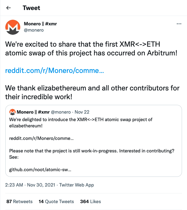 프라이버시 코인(익명성을 강화한 가상자산) 모네로(XMR)는 30일 트위터를 통해 "우리는 XMR 토큰과 이더리움(ETH)을 즉각 교환(아토믹스왑)할 수 있는 프로젝트를 구현하고 있다"면서 "아비트럼에서 아토믹스왑이 실행되는 것을 확인했다"고 밝혔다.
