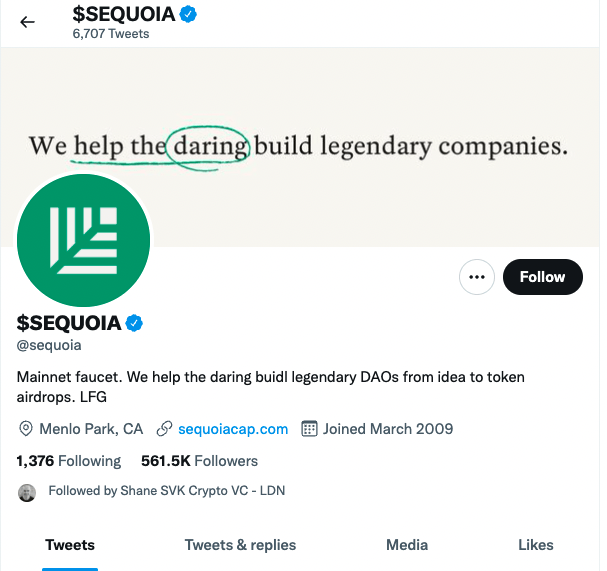 글로벌 벤처캐피탈 세쿼이아 캐피탈(Sequoia Capital)은 8일 트위터 프로필에 "우리는 용감한 사람들이 전설적인 탈중앙화자율조직(DAO)를 만들도록 돕는다"면서 "아이디어부터 토큰 에어드랍까지 (DAO를) 같이 개발할 사람(LFG)을 찾는다"는 상태 메시지를 올렸다.
