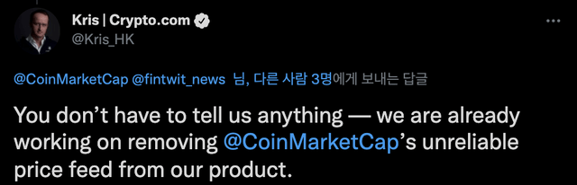 16일(현지시간) 블룸버그에 따르면 크리스 마잘렉(Chris Marszalek) 크립토닷컴 최고경영자(CEO)는 "코인마켓캡에서 제공하는 가격 정보는 신뢰할 수 없으며 이를 제거하기 위해 노력하고 있다"고 밝혔다.