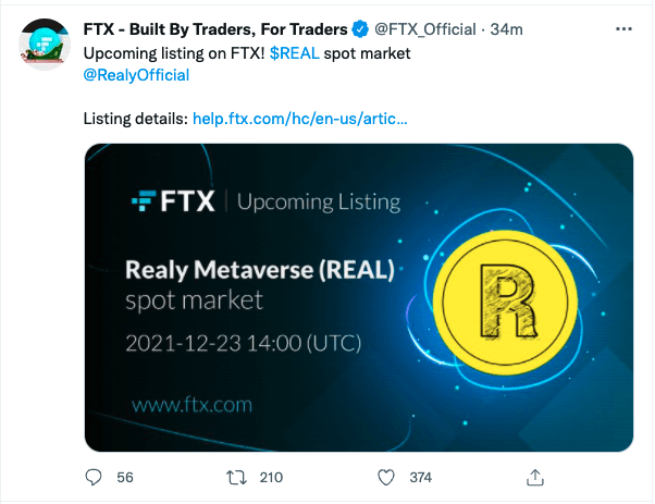 FTX 거래소는 22일 트위터를 통해 리얼리메타버스(REAL) 현물을 오는 23일 23시에 상장할 예정이라고 공지했다. 거래소는 해당 토큰 입출금 지원 일정 등은 구체적으로 밝히지 않았다.