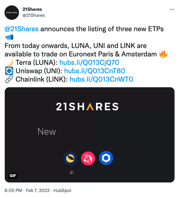 21쉐어즈, 테라·유니스왑·체인링크 ETP 출시입력 오전 5:46 · 2022. 02. 07.기사출처강민승 기자00공유하기링크 복사텔레그램엑스카카오톡글로벌 가상자산(암호화폐) 상장지수상품(ETP) 발행사인 21쉐어스(21Shares)는 7일 트위터를 통해 유럽에서 테라(LUNA)·유니스왑(UNI)·체인링크(LINK) ETP를 출시해 유로넥스트 파리·암스테르담 거래소에 상장했다고 밝혔다. 21쉐어스는 현재 26개의 가상자산 ETP를 운영하고 있다. LINKUNILUNA강민승 기자minriver@bloomingbit.io안녕하세요 블루밍비트 기자입니다.