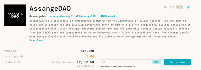 '위키리크스 설립자 석방 촉구' 어산지다오, 1만5000 ETH 모금수정 오전 5:39 · 2022. 02. 08.입력 오전 5:38 · 2022. 02. 08.기사출처강민승 기자00공유하기링크 복사텔레그램엑스카카오톡탈중앙자율기구(DAO) 모금 사이트인 쥬스박스에 따르면 8일 기준 어산지다오(AssangeDAO)의 모금액이 1만5120 ETH(약 558억원)을 돌파했다. 어산지다오란 줄리안 어산지 위키리크스 설립자의 석방을 지원하는 자율조직이다. 앞서 지난 7일 비탈릭 부테린 이더리움 창시자도 어산지다오에 10 ETH를 기부한 바 있다. ETH강민승 기자minriver@bloomingbit.io안녕하세요 블루밍비트 기자입니다.
