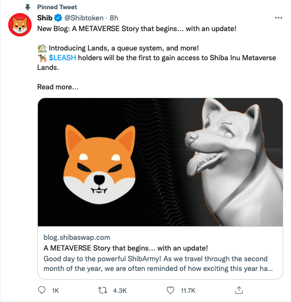 시바이누는 이날 공식 블로그를 통해 "우리는 메타버스가 커뮤니티에 가져올 잠재력과 확장성을 높게 평가하고 있다"면서 "우리의 메타버스 토지(시바랜드)는 곧 구매가 가능하다. 시바스왑 토큰인 도지킬러(LEASH) 홀더는 우선적으로 토지를 구매할 수 있을 것"이라고 설명했다.