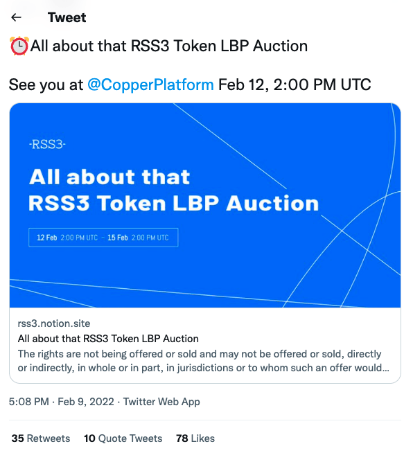 탈중앙화 컨텐츠 구독 서비스 RSS3는 9일 트위터를 통해 "오는 12일 오후 11시부터 15일까지 코퍼플랫폼에서 LBP 경매를 통해 RSS3 토큰을 판매할 예정"이라고 밝혔다.