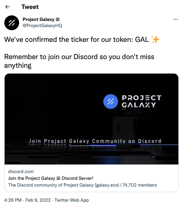 NFT(대체불가토큰) 인프라 개발사 프로젝트갤럭시는 9일 트위터를 통해 자체 토큰인 GAL을 발행할 예정이라고 밝혔다.