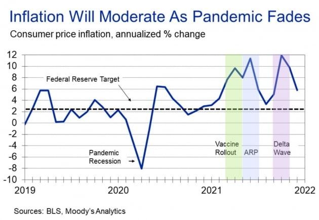무디스애널리틱스의 마크 잔디 수석이코노미스트는 이날 "인플레이션이 정점에 이르렀다"라는 트윗을 내보냈습니다. 그는 1월 CPI 헤드라인 수치가 40년 만의 최고치인 7.4%로 나올 것이라고 예상하면서도 "이는 기저효과를 반영한 것으로, 전월 대비로는 작년 10월의 절반 수준인 0.45% 증가에 그칠 것"이라고 전망했습니다. 그는 "지난 10월 델타 변이가 퍼졌을 때 인플레이션이 최고조에 달했고 팬데믹이 계속 사그라지면서 인플레이션도 사라질 것"이라고 내다봤습니다.