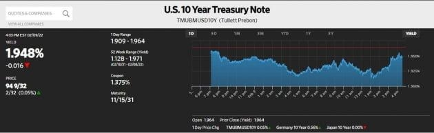 전날 전해드린 '금리 정점론'은 이날 더욱 힘을 얻었습니다. 지난 8일 연 1.97%까지 치솟았던 10년물 금리는 이날 한때 1.909%까지 떨어졌습니다. 독일 10년물 수익률이 전날 0.264%에서 0.218%로 하락하는 등 유럽 채권부터 수요가 살아난 게 영향을 줬습니다. 또 이날 미 국채 입찰에서 미 국채에 대한 수요가 충분하다는 게 확인됐습니다.