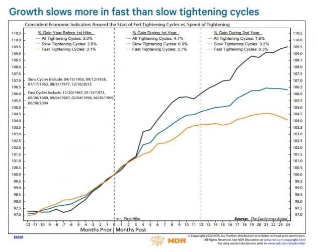긴축 속도도 매우 중요하다. 긴축이 시작되면 미국 경제는 2년 차에 성장이 완만해졌지만, 일반적으로 느린 긴축 사이클 때는 무시할 만했다. 하지만 빠른 사이클 때는 2년 차에 하락 폭이 컸다. (FOMC가 열릴 때마다 올리면 빠른 사이클, 그 외의 경우 느린 사이클로 간주)