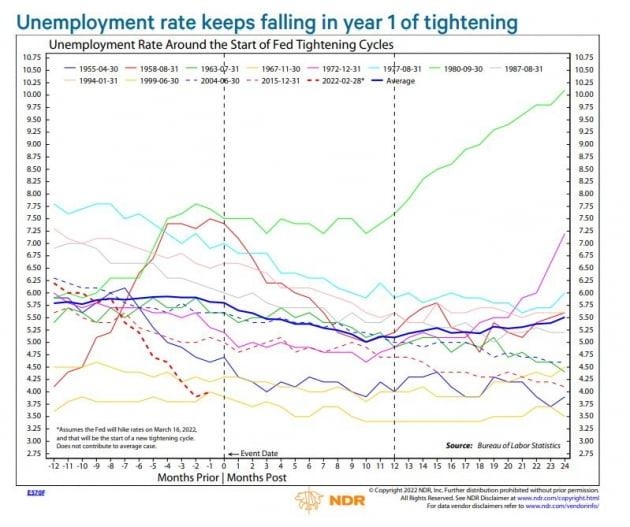 실업률은 첫 금리 인상 이후 1년 동안 평균 0.7%포인트 하락했다. 1980~82년 더블딥 침체를 제외하고는 모든 경우에 하락했다. 평균 실업률은 긴축이 시작된 지 10개월 만에 최저치를 기록한 뒤 상승 반전한다.