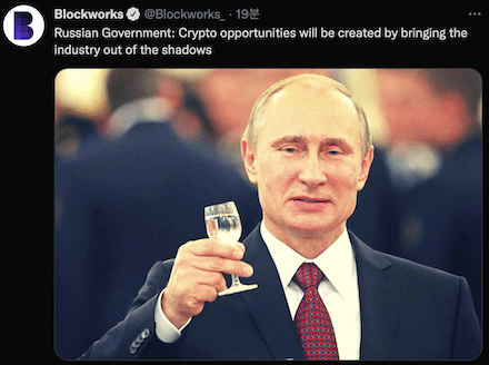 가상자산(암호화폐) 전문 미디어 블록웍스는 10일 트위터를 통해 "러시아 정부가 가상자산 업계를 그림자에서 꺼내 기회를 창출하게 할 것이라고 발언했다"고 보도했다.
