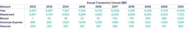 비트코인 거래량이 아메리칸익스프레스를 앞질렀다는 분석이 나왔습니다. 미국 NYDIG는 9일 보고서에서 "2021년 비트코인이 3조달러 규모의 결제를 처리해 아멕스(1조3000억달러)와 디스커버(5000억달러)를 추월한 것으로 추정된다"고 밝혔습니다.