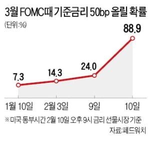 인플레이션이 진정될 기미가 보이지 않자 기준금리를 큰 폭으로 인상해야 한다는 주장이 확산하고 있다. 이날 씨티은행은 Fed가 다음달 연방공개시장위원회(FOMC)에서 기준금리를 50bp(1bp=0.01%포인트) 인상할 것이라는 전망을 내놨다. 지난달 28일 보고서에선 0.25%포인트 올릴 것으로 내다봤지만 10여 일 만에 전망치를 수정한 것이다. 또 올해 말 바람직한 기준금리 수준도 연 1.25%에서 연 1.5%로 높여 잡았다. 도이체방크도 3월 기준금리 인상폭을 50bp로 예상하며 기존 입장을 바꿨다.