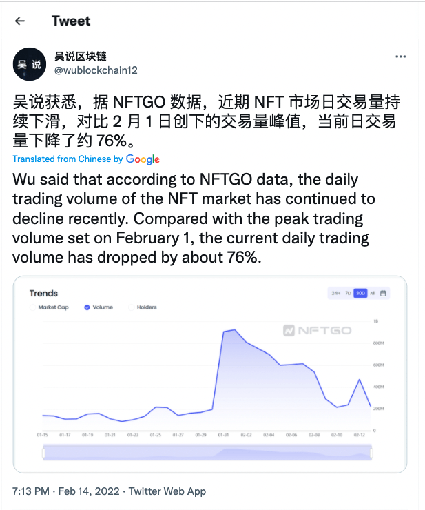 "NFT 거래량, 이달 초 대비 76% 급감"수정 오전 5:33 · 2022. 02. 14.입력 오전 5:32 · 2022. 02. 14.기사출처강민승 기자00공유하기링크 복사텔레그램엑스카카오톡가상자산(암호화폐) 전문 미디어 우블록체인은 14일 NFTGO 데이터를 인용 "최근 NFT(대체불가토큰) 거래량이 매일 감소하고 있다"면서 "이날 NFT 거래량은 지난 1일과 비교해 76% 감소했다"고 밝혔다. NFT강민승 기자minriver@bloomingbit.io안녕하세요 블루밍비트 기자입니다.
