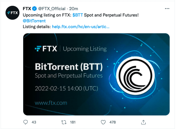 FTX 거래소, 오는 15일 MINA·BTT 상장입력 오전 9:21 · 2022. 02. 14.기사출처강민승 기자00공유하기링크 복사텔레그램엑스카카오톡FTX 거래소는 14일 트위터를 통해 "오는 15일 미나프로토콜(MINA) 무기한 선물, 비트토렌트(BTT) 무기한선물 및 현물을 상장한다"고 공지했다. 거래소는 해당 토큰 입출금 지원 일정 등은 구체적으로 밝히지 않았다. BTTMINA강민승 기자minriver@bloomingbit.io안녕하세요 블루밍비트 기자입니다.