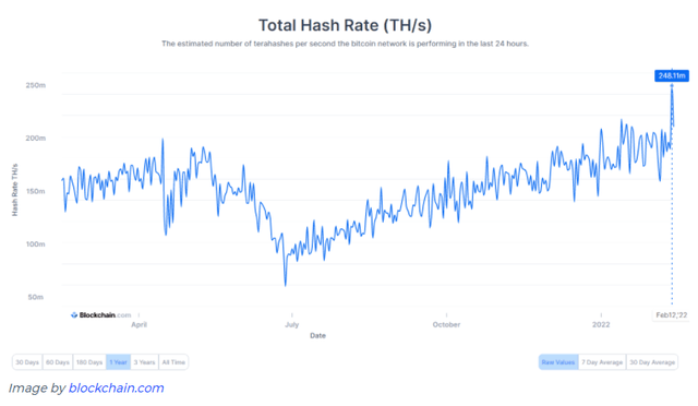 14일(현지시간) 가상자산(암호화폐) 전문 미디어 유투데이가 블록체인닷컴 데이터를 인용해 비트코인(BTC) 해시레이트가 역대 최고치(248EH/s)를 기록했다고 보도했다.