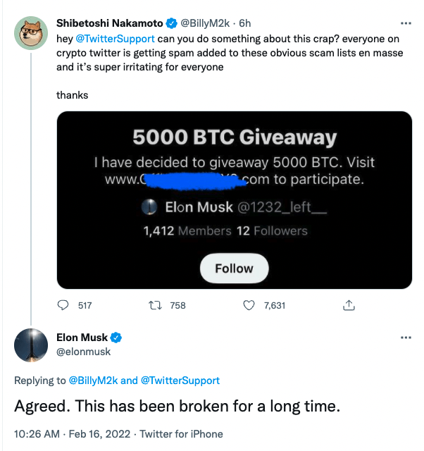 이에 머스크는 "동의한다. 가상자산(암호화폐) 스팸은 매우 오랫동안 문제가 되고 있다"고 말했다.